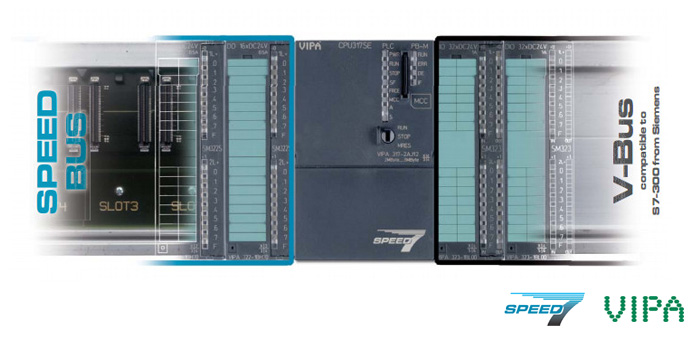 Basado en el procesador SPEED7 de VIPA, el PLC 300S es un sistema de control de alta velocidad, programable con STEP®7 de Siemens y compatible con módulos S300. Todas las CPU posen memoria integrada para programas y datos; por esta razón pueden operar sin tarjetas de memoria adicional. La memoria integrada puede expandirse con las memorias VIPA MCC. Todas las CPUs del Sistema SPEED7 están equipadas con puerto Ethernet, puerto MPI y un puerto RS485 configurable Profibus / Modbus / USS / 3964R /PtP. Debido a la alta performance y flexibilidad de configuración, el sistema SPEED7 es apropiado para aplicaciones de rango medio hasta aquellas de muy altos requerimientos.